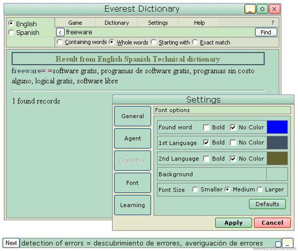 Tendrás a tu disposición una completa base de datos que puedes ir aumentando con los diccionarios que más te interesen bajándolos desde la Web del autor. Los hay en varios idiomas y además especializados en diversos campos lingüísticos. El de español, por ejemplo, lo tienes aquí.